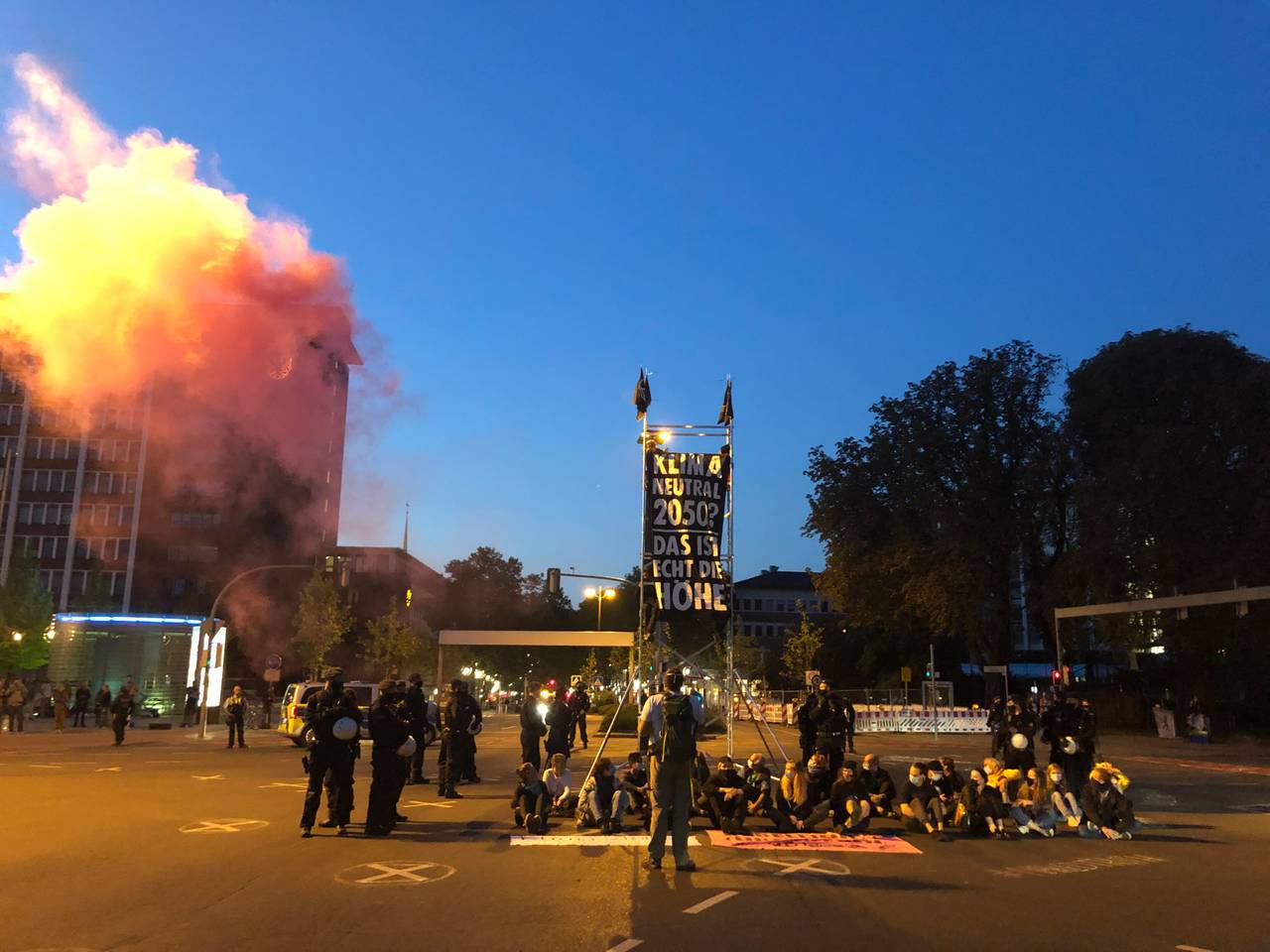 Mit der Aktion wollten die Demonstration die Einhaltung der Klimaziele schon vor 2050 einfordern. Insgesamt verlief die nicht angemeldete Kundgebung friedlich, wohl auch, weil sich die Polizei überwiegend zurückhielt und sich darauf beschränkte, den Verkehr umzuleiten. Erst nach 21:00 Uhr wurden etwa 21 Menschen von der Polizei weggetragen. Für das Gerüst wurde die Unterstützung der Feuerwehr angefordert, sagte Polizeisprecherin Dana Seketa. Dabei holten die Höhenretter der Feuerwehr vier Demonstranten vom Gerüst und 21 Menschen wurden von der Polizei weggetragen.