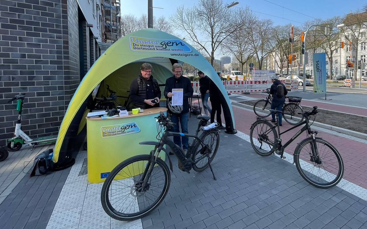 An der Ecke Ostwall / Arndstraße hat die Kampagne "Umsteigern" ein Zelt aufgebaut, fachkundiges Personal überprüft dort die Bremsen, das Licht, die Federung und einiges mehr. Der Standort direkt am neuen Radwall wurde bewusst gewählt, sagte Planungsdezernent Ludger Wilde.