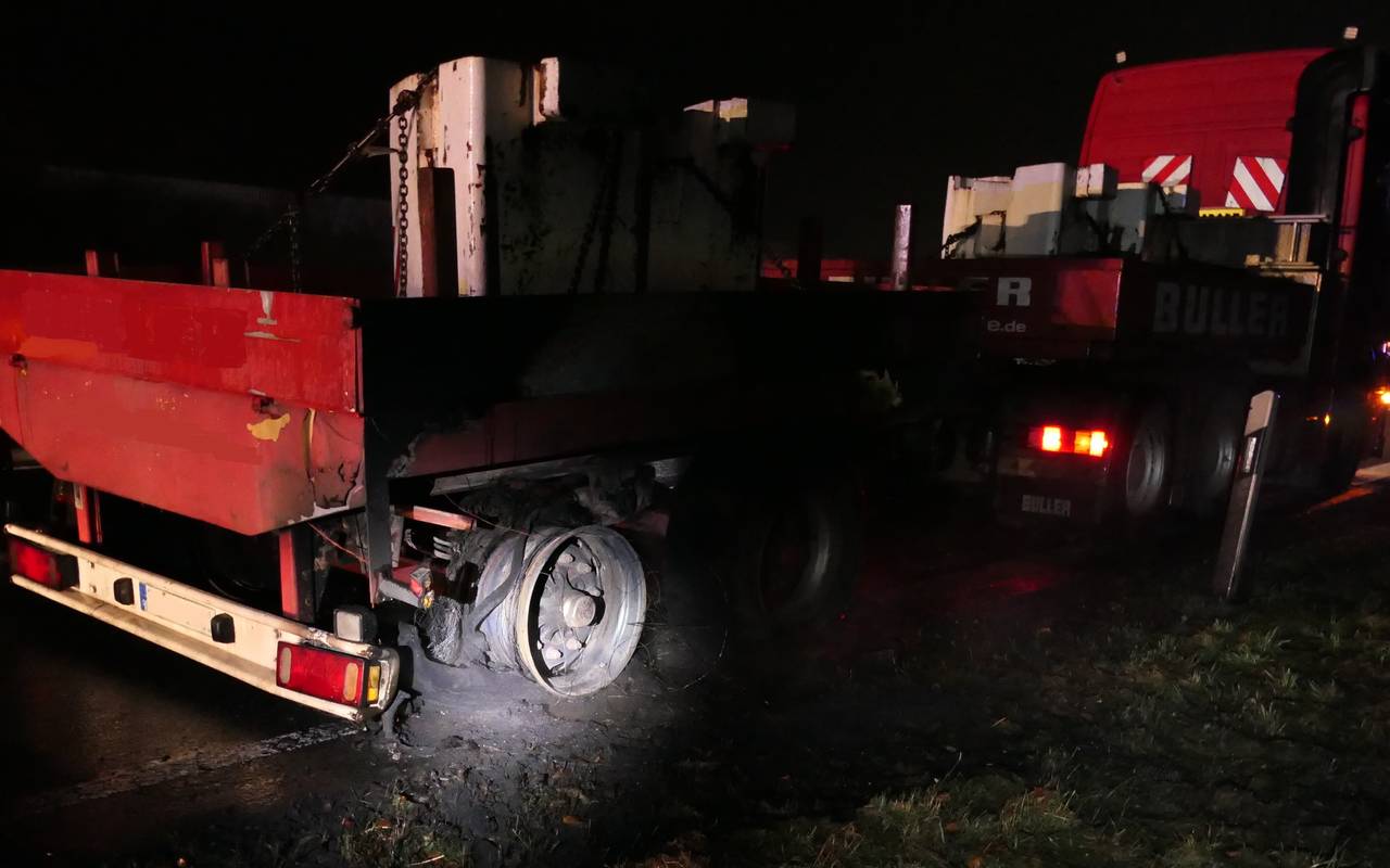 Kurz nach 4:30 Uhr am Dienstag (7.12.) hörte die Fahrerin auf der A2 Richtung Hannover in Höhe des Parkplatzes "Kleine Herrenthey" einen lauten Knall, woraufhin sie auf den Seitenstreifen fuhr. Dort zeigte sich, dass der Anhänger des mit Krangewichten beladenen Gespanns im Bereich der Reifen brannte.