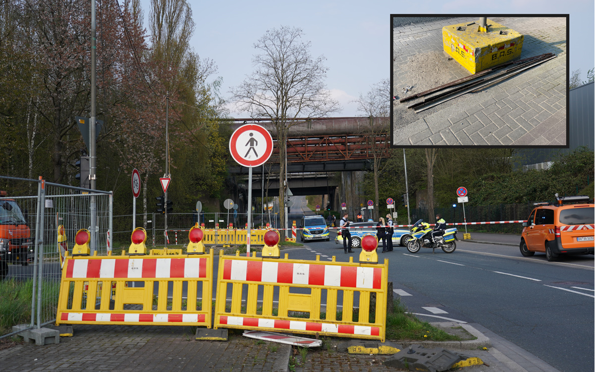 Das Winkeleisen fiel laut Dortmunder Polizei mit solcher Wucht auf die darunter liegende Fahrbahn, dass der Asphalt leicht beschädigt wurde. Die Dortmunder Feuerwehr entfernte noch zwei weitere Winkeleisen.