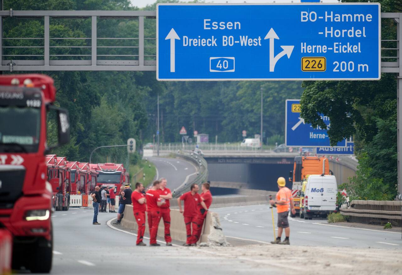 Arbeiter stehen auf der gesperrten A40-Autobahn im Ruhrgebiet.