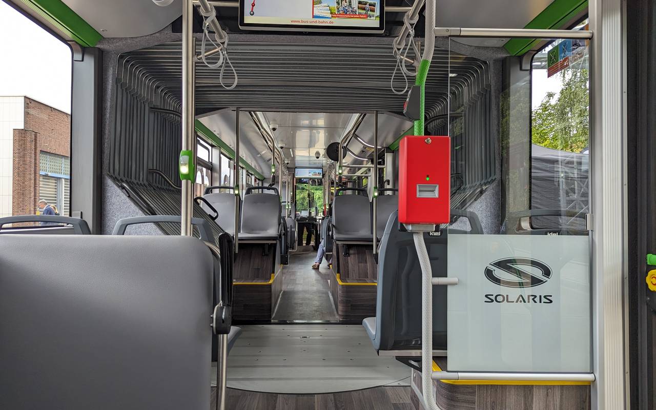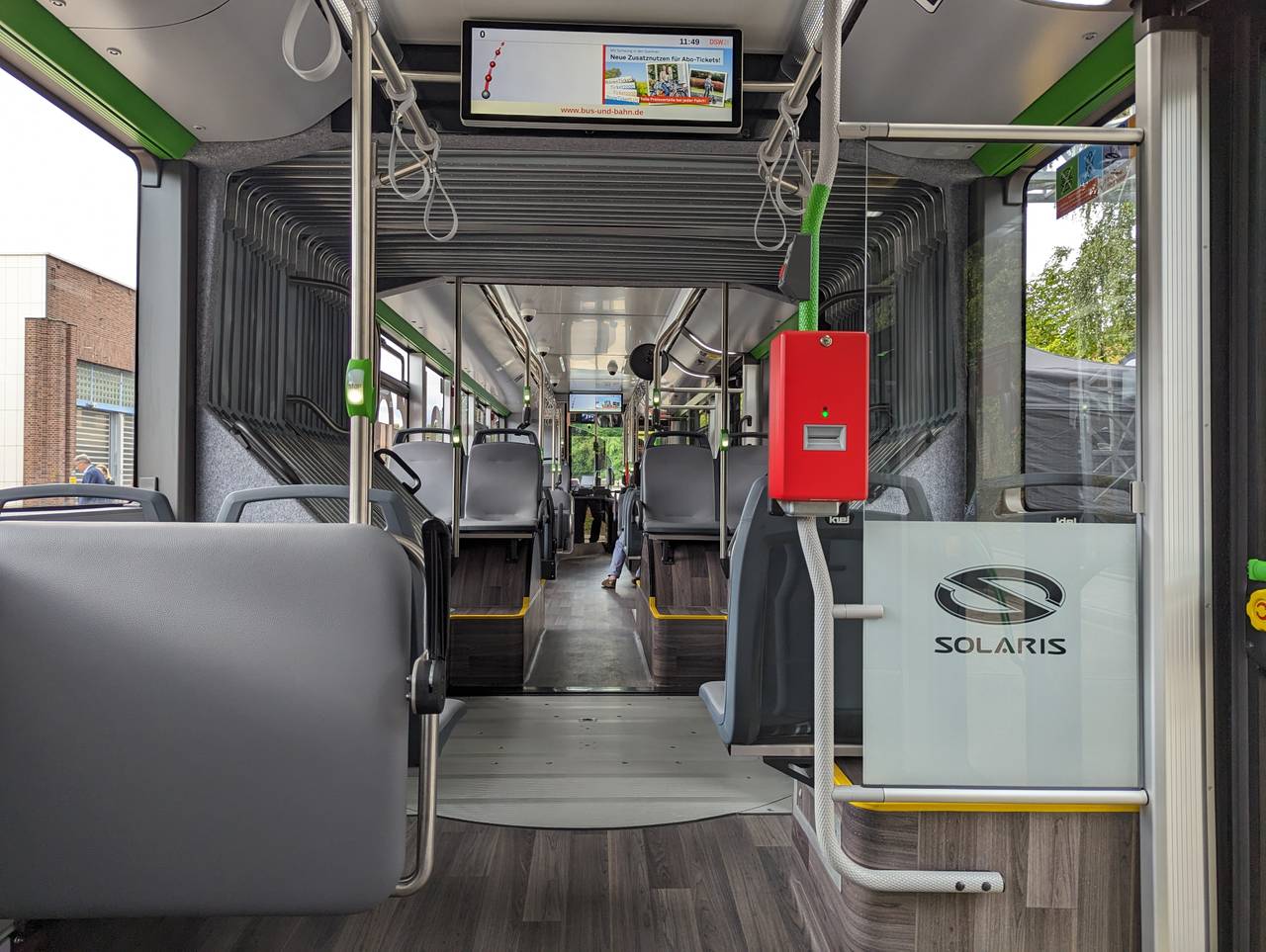 Hersteller Solaris sind seit einiger Zeit in Dortmund (siehe Titelbild). Ab Freitagmittag (22.09) sind sie im Pilotbetrieb. Gegen Mittag hat der erste E-Bus den Betriebshof in Brünninghausen verlassen. Sie fahren immer nur eine Linie, und werden dann aufgeladen. Samstag (23.09) ergänzen sie den Verkehr rund um die Museumsnacht und das BVB-Spiel.