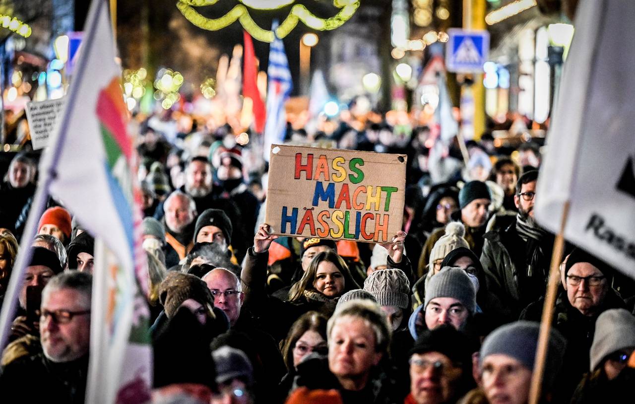 Zu Anfang dieses Jahres gingen im ganzen Land hunderttausende Menschen auf die Straße. Viele waren zum ersten Mal auf einer Demonstration. Die Mitte der Gesellschaft stand auf, um sich einzusetzen für die Demokratie und um ein Zeichen gegen Hass und Hetze zu setzen. Diese Groß-Demonstrationen fotografisch ins Bild zu setzen war Aufgabe vieler Pressefotografinnen und -fotografen in diesem Jahr. Die Jury beeindruckte dieses Bild durch seine Komposition: Die große Menge der Demonstrantinnen und Demonstranten, die Masse, die ein Gesicht bekommt durch die Frau in der Bildmitte. Ihr farbiges Plakat kontrastiert mit der dunkel gehaltenen Umgebung und dem unscharfen Rahmen. Die junge Frau steht im Zentrum, blickt den Betrachter direkt an und steht damit exemplarisch für alle Demonstrierenden und für das Selbstbewusstsein der Mitte der Gesellschaft, für die Demokratie aufzustehen.