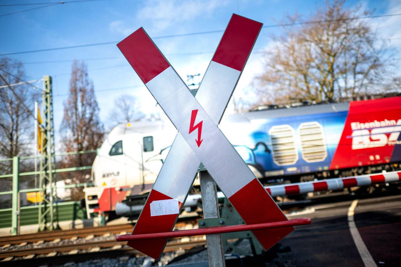 Ein Zug fährt über den Bahnübergang Oldenburg-Ofenerdiek