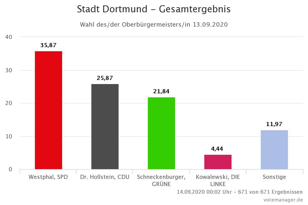 Im Rennen um das Amt des Dortmunder Oberbürgermeisters wird es eine Stichwahl geben. Keiner der Favoriten von SPD, CDU und Grünen konnte im ersten Wahlgang eine absolute Mehrheit erzielen. Mit 35.87% liegt SPD-Kandidat Thomas Westphal etwa zehn Prozentpunkte vor Andreas Hollstein von der CDU (25,87%). Die Grüne Daniela Schneckenburger kommt auf rund 22%. Zur Stichwahl stehen daher Thomas Westphal und Andreas Hollstein. Entscheidend wird nun sein, wie sich die Wähler der Grünen und der sonstigen Kandidaten entscheiden werden.