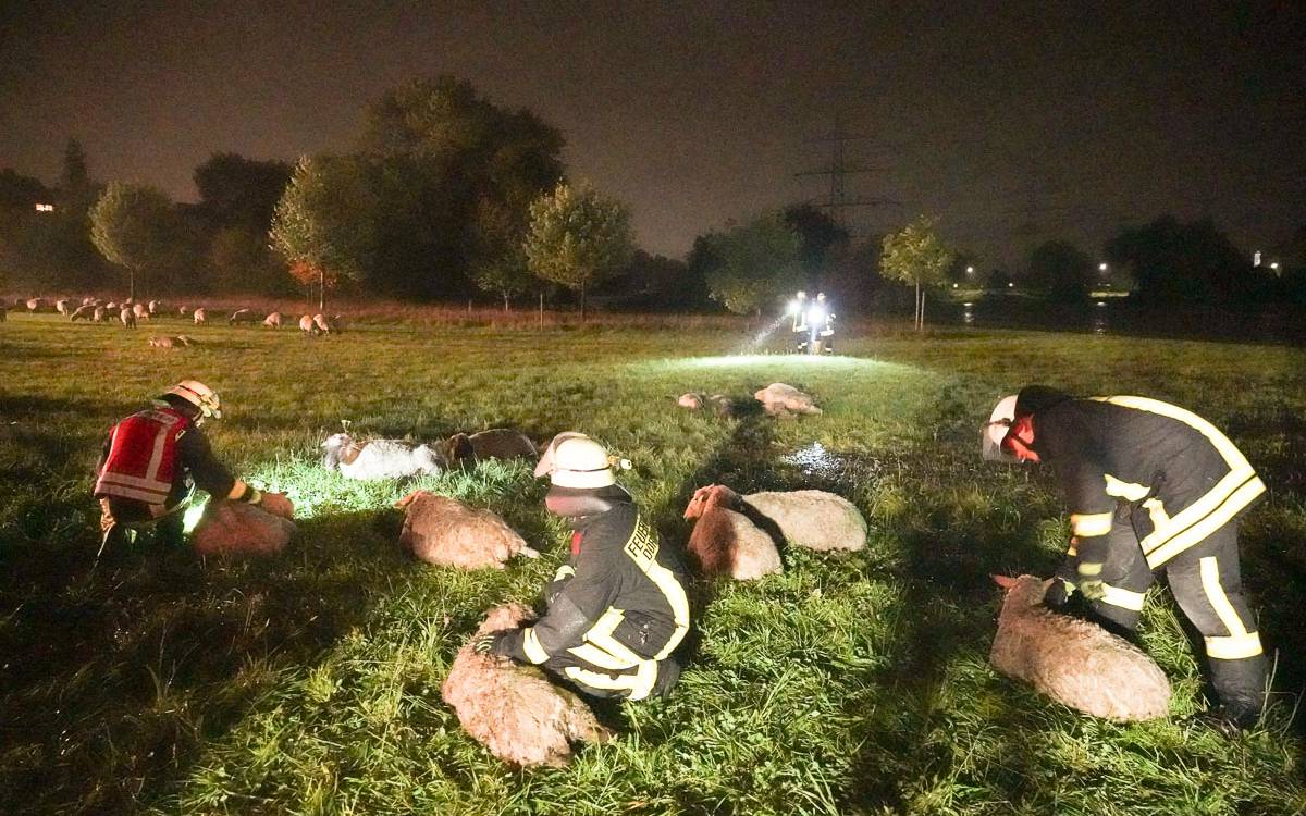 Starkregen hatte dort den Grotenbach über die Ufer treten lassen. Es bildete sich ein großer See. Auf einer angrenzenden Weide an der Straße Hockeneicke drohten 350 Schafe zu ertrinken. Die Einsatzkräfte konnte die Herde bis auf 20 Tiere mit Booten und selbstgebauten Stegen retten. Für ihr tierfreundliches Engagement hat PETA die Feuerwehr Dortmund nun mit einer Urkunde ausgezeichnet.