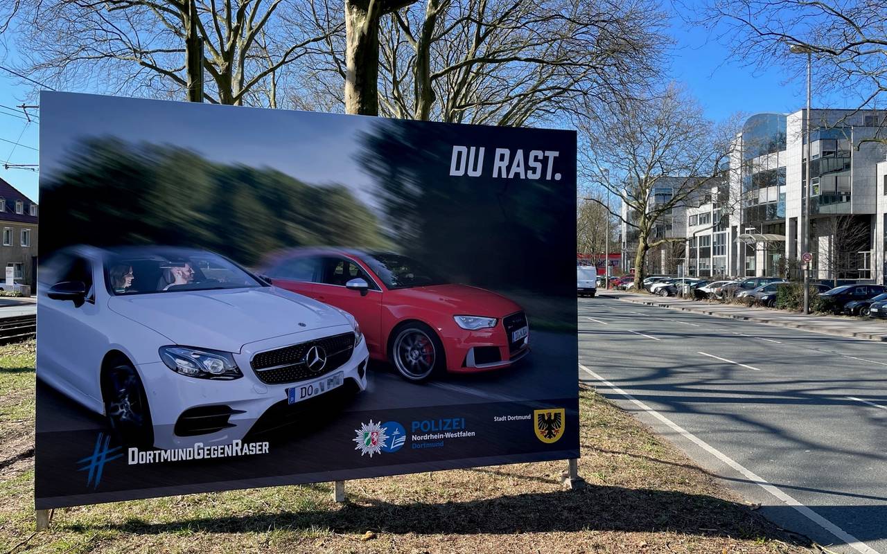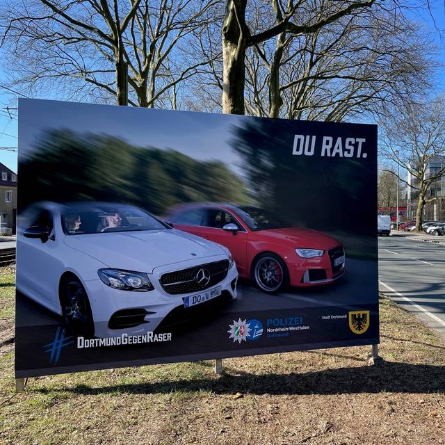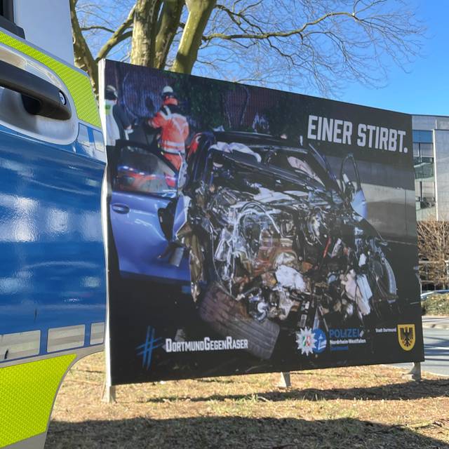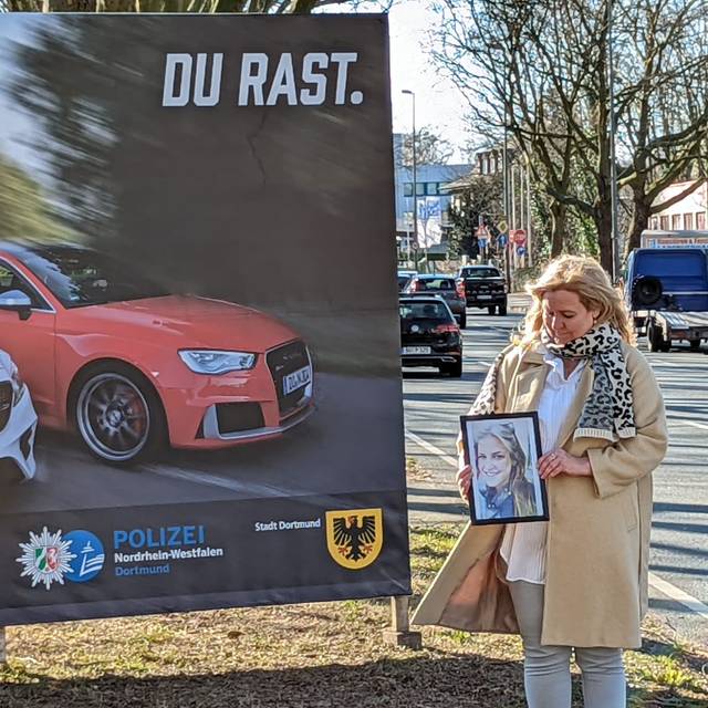 Die Überschriften der hintereinander aufgestellten Plakate ergeben den Satz: "Du rast, einer stirbt, hier wohnst du dann". So sollen Raser abgeschreckt und schwere Unfälle verhindert werden. Das ist eine gemeinsame Aktion von Polizei und Stadt Dortmund. Bei der Vorstellung der Plakate war auch die Dortmunderin Claudia Wagner dabei. Ihre Tochter Marie ist 2014 beim Inlineskaten in Nürnberg durch einen Raser getötet worden. Claudia Wagner will sich deshalb gegen Raser einsetzen