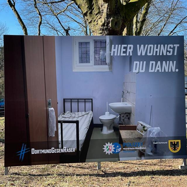 Drei Plakate sollen an der B1 in Dortmund dafür sorgen, dass Autofahrer bald langsamer fahren. Sie zeigen ein illegales Autorennen, ein komplett zerstörtes Auto und eine Gefängniszelle.