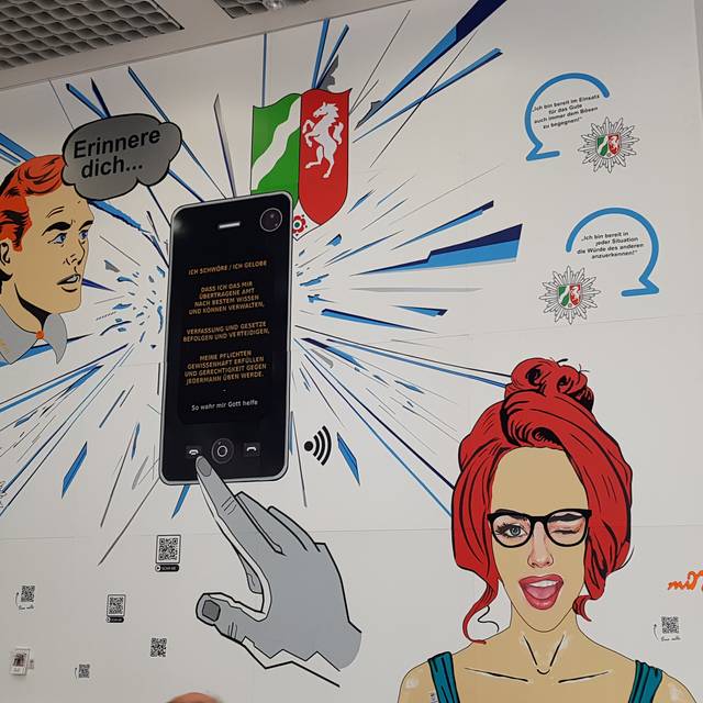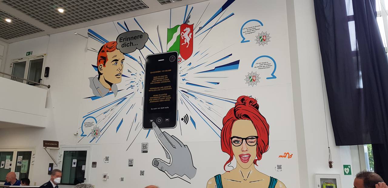 Zum ersten Tag der sogenannten Werteorientierung im Polizeipräsidium Dortmund hatte NRW-Innenminister Herbert Reul eine Videobotschaft geschickt. Hintergrund für die Aktion sind die Ermittlungen gegen 15 Polizisten aus Dortmund, die sich an rechtsextremen Chats beteiligt haben sollen. Mit Hilfe von QR-Codes soll das 36 Quadratmeter große Kunstwerk im Pop Art Stil die Grundwerte der Polizeiarbeit vermitteln.