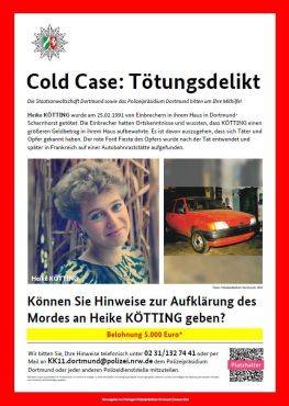 Aktuell haben sich die Beamten sechs Mordfälle vorgenommen. Zum Beispiel den an der damals 28 Jahre alten Dekorateurin Heike Kötting. Die Dortmunderin war im Februar 1991 in ihrem Haus in Dortmund-Scharnhorst getötet worden. Einbrecher mit Ortskenntnissen wussten, dass die Frau einen größeren Bargeldbetrag im Haus aufbewahrte. Es habe sich um einen Gewalt-Exzess gehandelt, nach Spurenlage sei von mindestens zwei Tätern auszugehen.