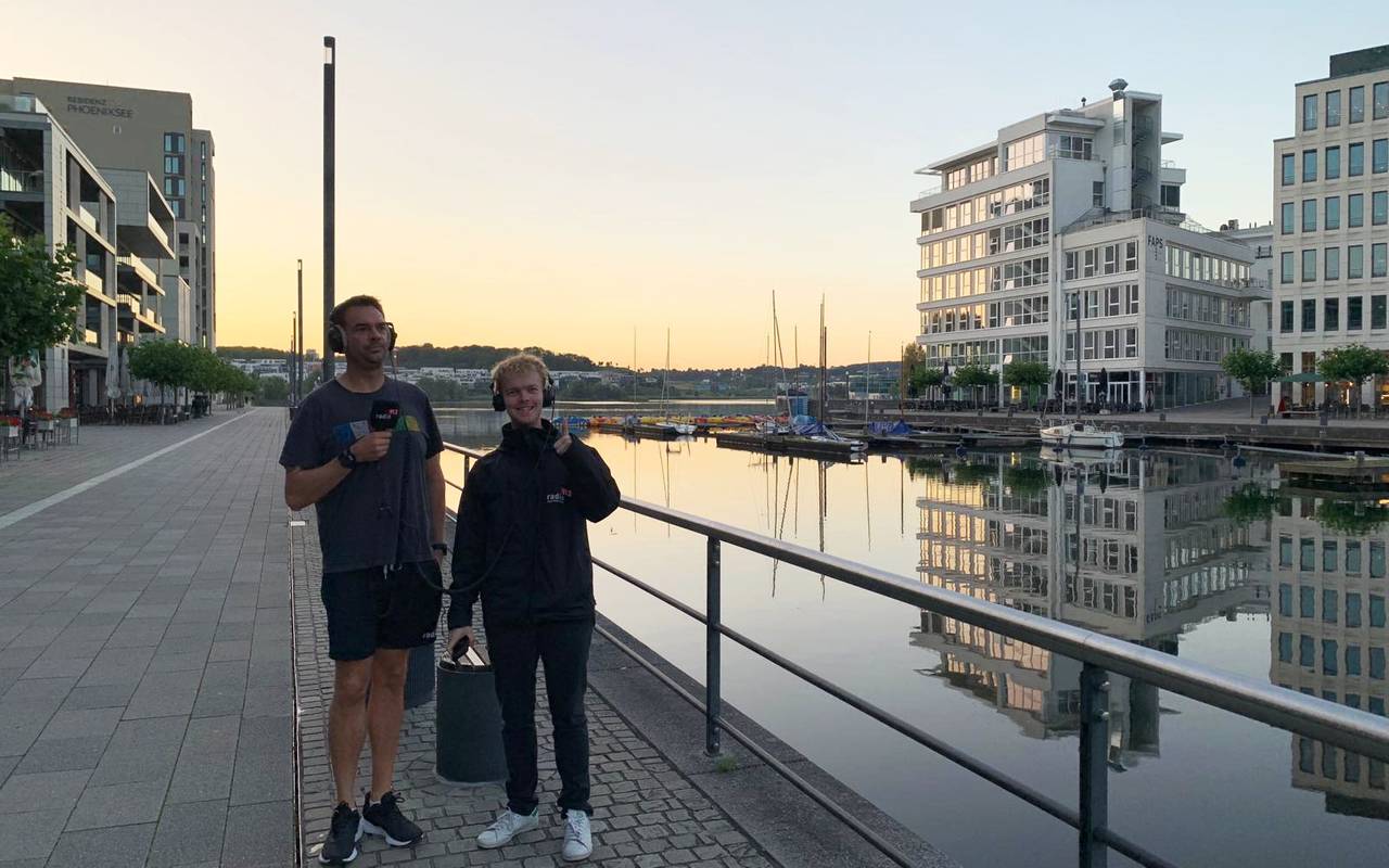 So idyllisch sind unsere Guten Morgen Dortmund Moderatoren selten in den Tag gestartet. Noch liegt der Phoenix See glatt und ruhig vor ihnen, die Sonne färbt den Himmel gelb und bis auf ein paar Kanada-Gänse und Tauben sind sie komplett alleine. Wer vorbei joggt, wird natürlich angefeuert. Also kommt vorbei, das Radio 91.2 Team freut sich!