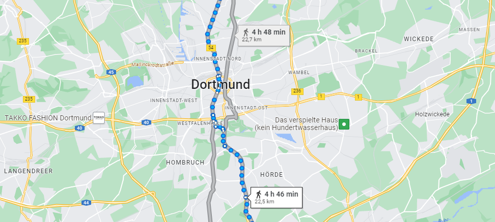 Von der Radio 91.2-Redaktion geht es zu Fuß weiter quer durch Dortmund. Über die Hagener Straße vorbei am BVB Stadion geht es für ihn weiter vorbei am Zoo Dortmund. Weg von der Straße und rein in mehr Natur und Wald. Insgesamt läuft Tim 25 Kilometer zu Fuß, bis er am Hengsteysee wieder ankommt.