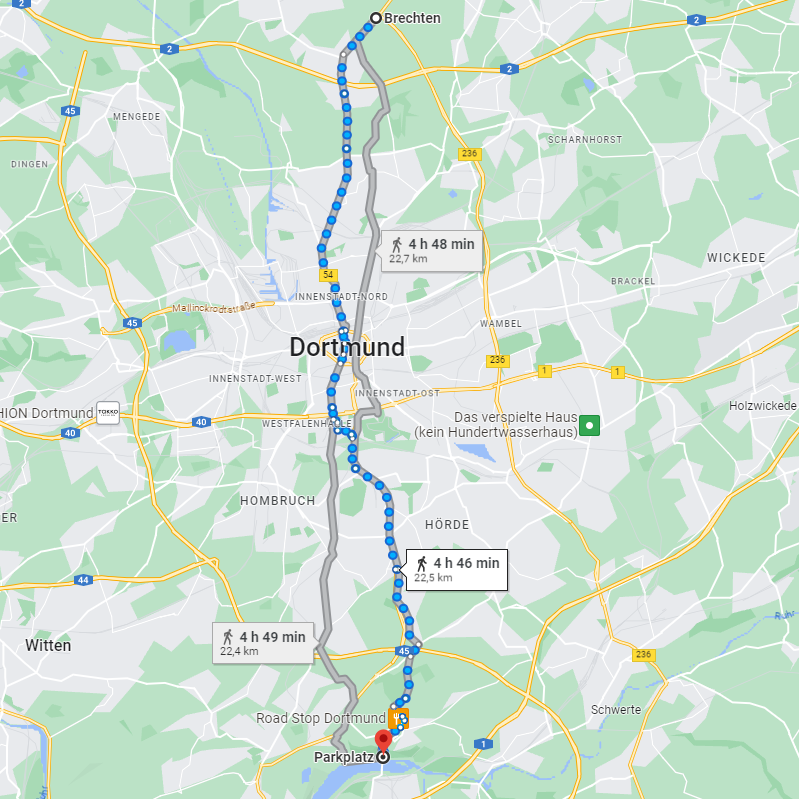 Jetzt geht es für ihn nach Dortmund Brechten, das dauert noch so rund 30 Minuten. Danach werden die Klickschuhe gegen die Wanderschuhe getauscht - zu Fuß geht es die Strecke dann nämlich wieder zurück.