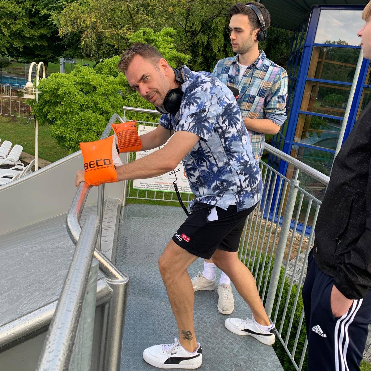 Noch ist das Becken draußen ziemlich leer. Kein Wunder: das ist auch nicht beheizt. Eine Liege musste unser Guten Morgen Dortmund Team also nicht reservieren. Radio 91.2 Moderator Tim Schmutzler hat sich schon mal die Schwimmflügel angezogen, denn er will auf das Piratenschiff. Danach geht's noch eine Runde rutschen. Mit dabei ist Schichtleiter Tobias Majorczik. "Es muss alles sauber gemacht werden, bevor die Gäste kommen", erklärt er. "Und ja, da testen wir auch schon mal die Rutsche morgens, um zu gucken, ob alles sicher ist."