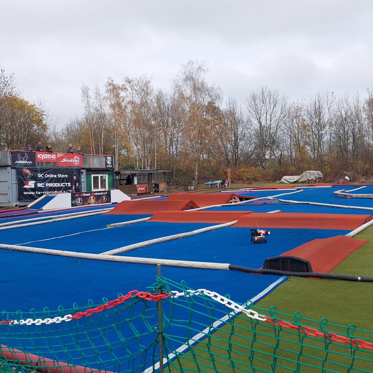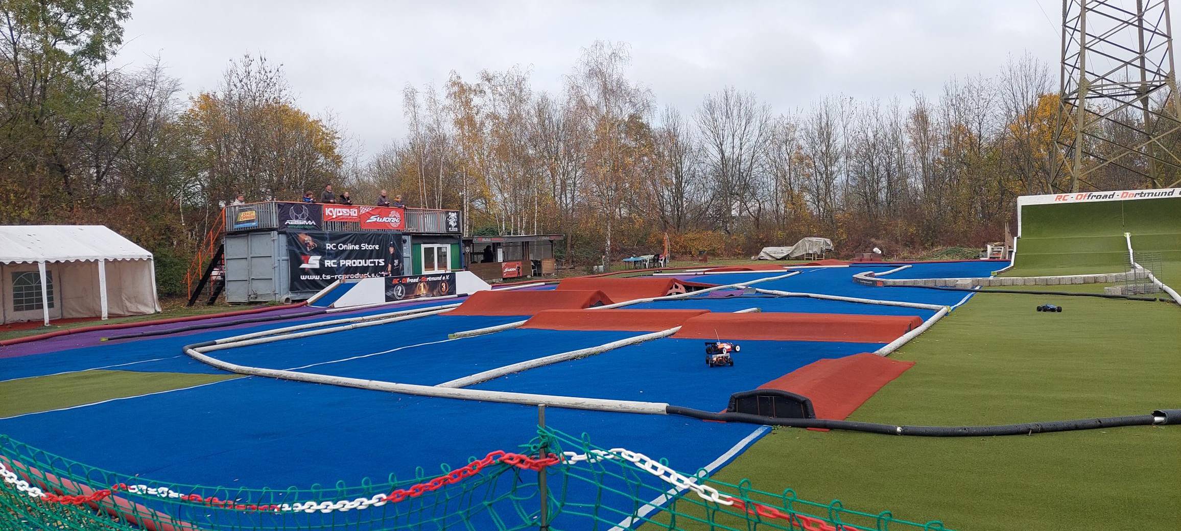 Der Verein RC Offroad Dortmund hat eine Rennstrecke für die Racing-Cars aufgebaut. Sie besteht aus grünem, blauem und rotem Teppich aus Kunstrasen. Auf einem ehemaligen Baucontainer können die Fahrer mit ihrer Fernbedienung in der Hand ihre Flitzer mit Vollspeed über die Strecke rasen lassen.