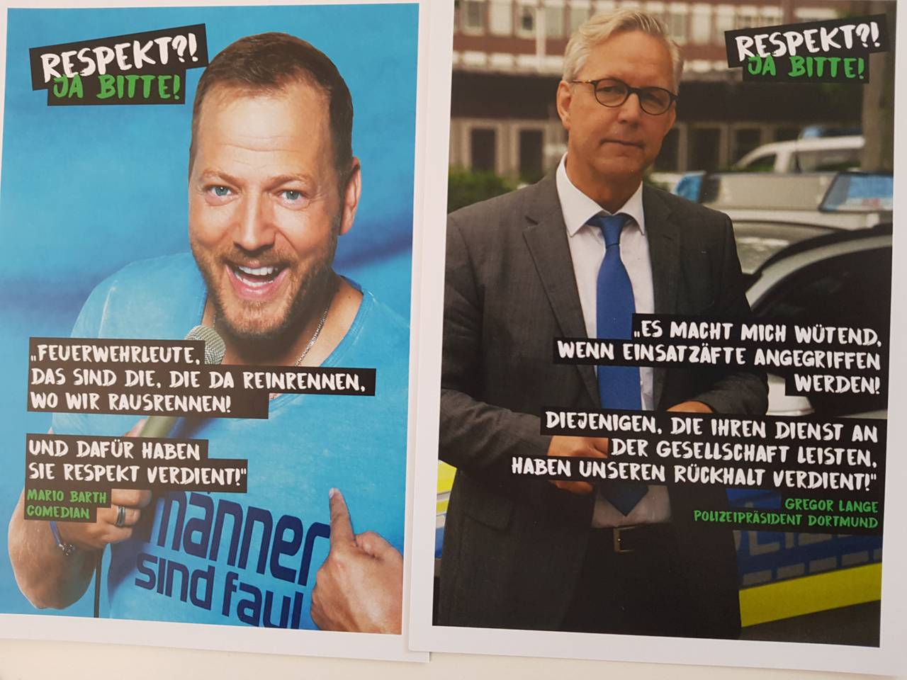 "Respekt?! Ja bitte!" ist eine Aktion der Deutschen Feuerwehrgewerkschaft (DFeuG NRW) und der Gewerkschaft der Polizei (GdP - Dortmund), die hiermit für Respekt und Anerkennung gegenüber unseren Einsatzkräften werben.