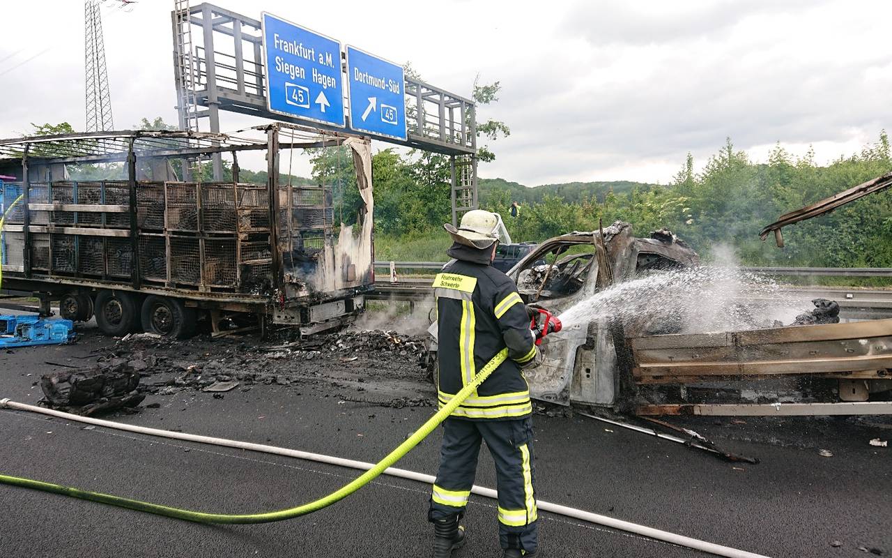 Auf der A1 zwischen Schwerte und Westhofener Kreuz sind heute Vormittag ein Kleintransporter und ein LKW-Anhänger in Brand geraten. Aus bislang ungeklärter Ursache war gegen 9.40 Uhr in Richtung Köln der Fahrer eines Kleintransporters auf einen vorher fahrenden Sattelzug aufgefahren. Beide Fahrer verletzten sich und wurden in Krankenhäuser gebracht. In Folge des Unfalls gerieten der Kleintransporter und der LKW-Anhänger in Brand.
