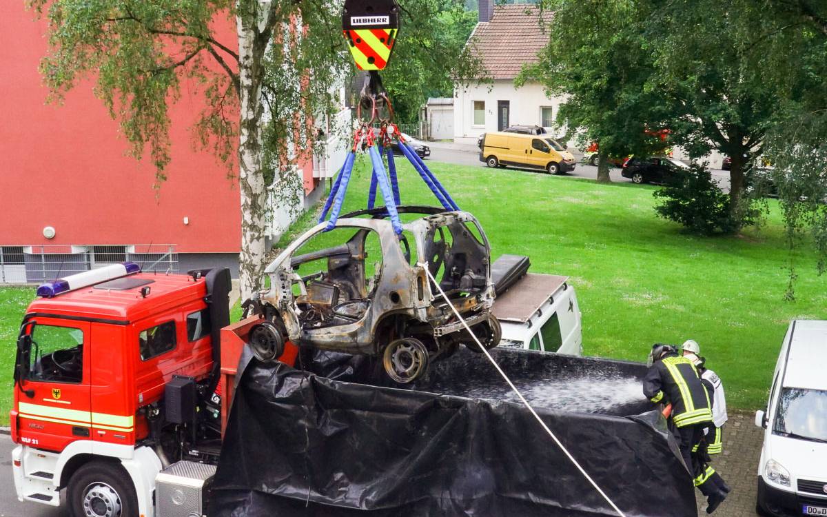 Die Dortmunder Feuerwehr hat heute ein brennendes Elektroauto mit Hilfe eines aufwendigen Wasserbads gelöscht. Das Feuer brach heute Morgen gegen 4 Uhr an der Oberhausstraße in Hombruch aus.