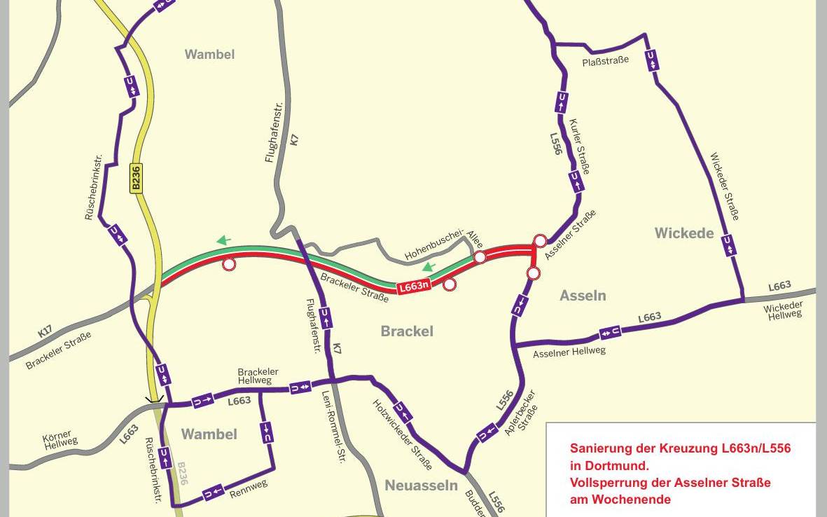 Der Kreuzungsbereich Asselner- und Brackeler Straße bei uns in Dortmund wird erneuert. Deshalb ist die Brackeler Straße ab dem heutigen Freitag (02.08.) in Richtung Innenstadt zwischen Asselner Straße und Hohenbuschei-Allee gesperrt. Außerdem muss die Asselner Straße zwischen Buschwiese und Asselburgstraße gesperrt werden. Weiträumige Umleitungen sind ausgeschildert. Bis zum Abschluss der Arbeiten bleibt auch die Brackeler Straße stadtauswärts ab der B236 dicht.