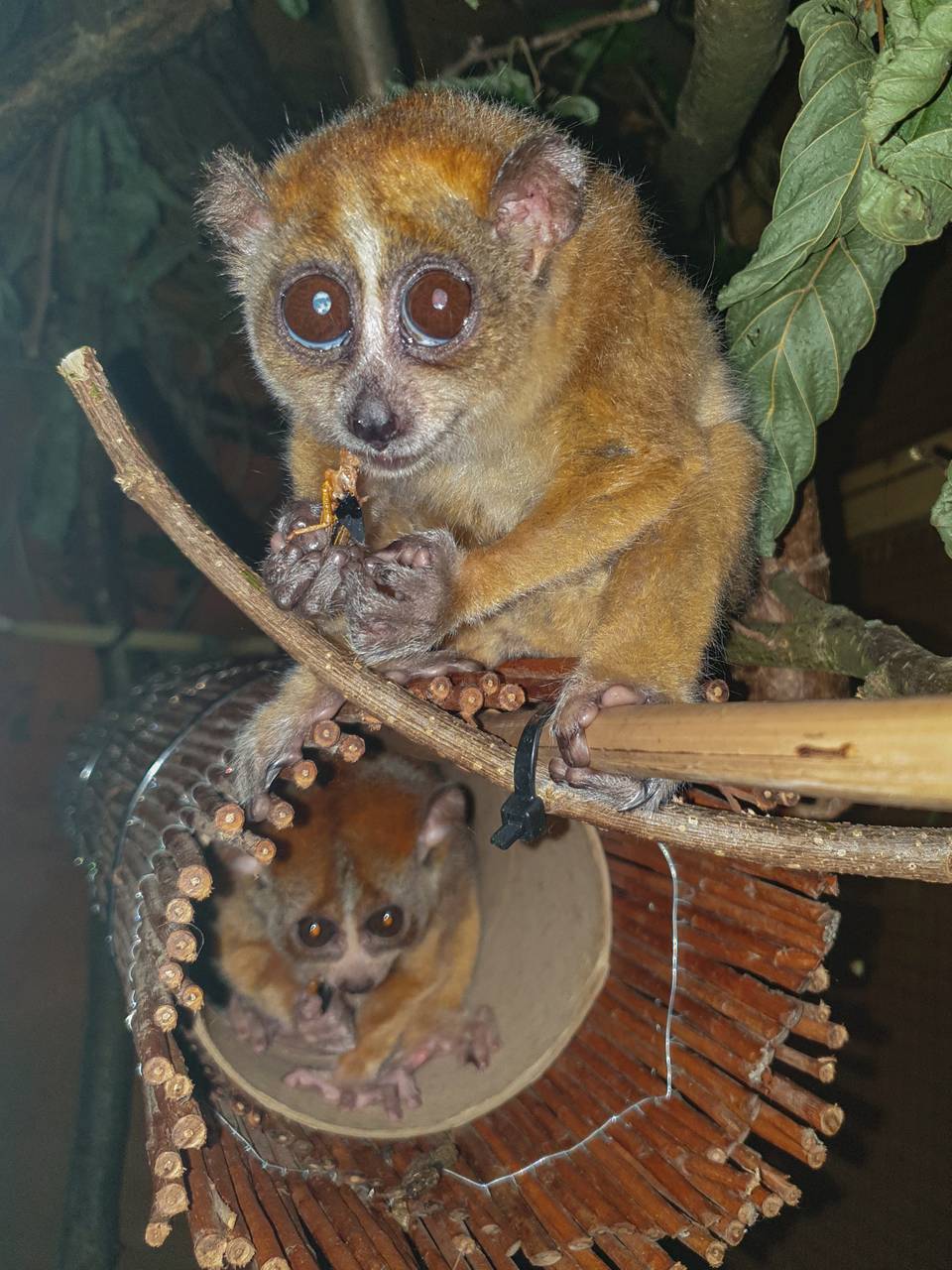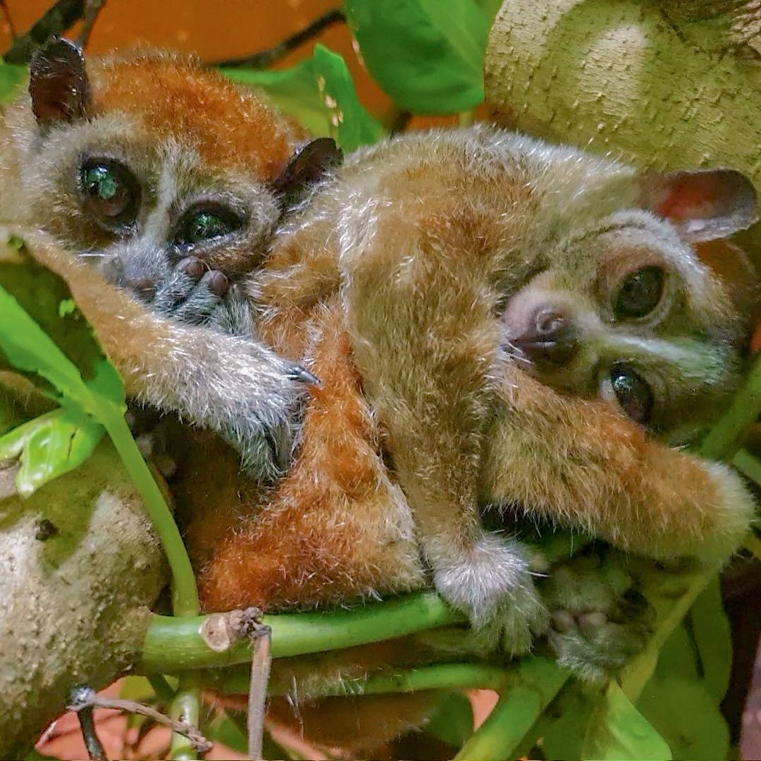 Zwergplumploris sind gerade mal so groß wie ein Kaninchen und wiegen ungefähr 500 Gramm. Obwohl sie so niedlich aussehen, sind in der Wildnis lebende Plumploris giftig. Damit sie ihr Gift durch einen Biss erst gar nicht übertragen können, werden ihnen die Zähne oft brutal gezogen. Die Zwergplumploris hier im Zoo haben dieses Schicksal zum Glück nicht erleben müssen.