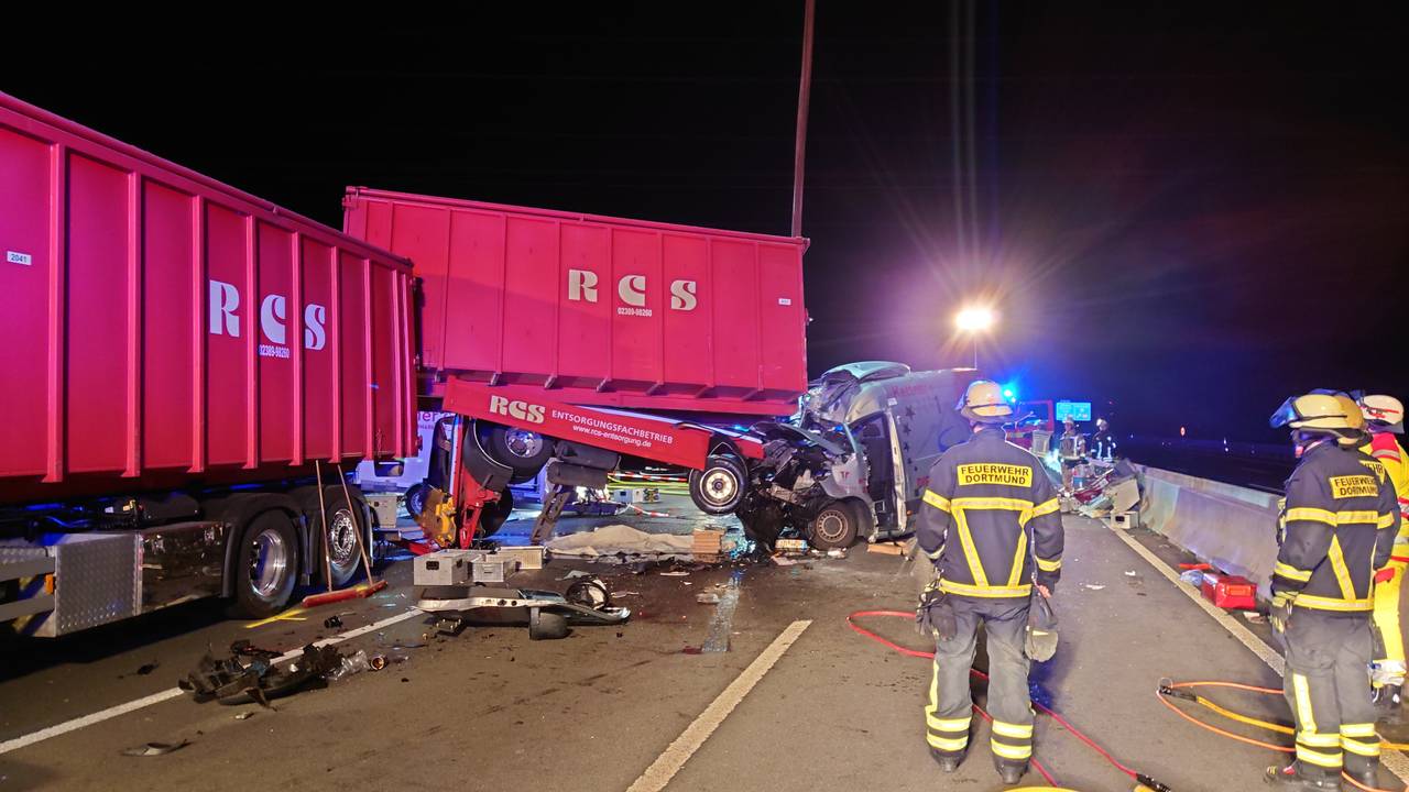 Auf der A1 am Kreuz Dortmund/Unna hat es am frühen Mittwochmorgen einen tödlichen Auffahrunfall gegeben. Gegen zwei Uhr morgens war ein Kleintransporter auf einen Lastwagen aufgefahren. Der 39-jährige Beifahrer verstarb, der 40-jährige Fahrer wurde schwer verletzt, sagte die Polizei im Gespräch mit Radio 91.2. Der 35-jährige LKW-Fahrer blieb unverletzt.