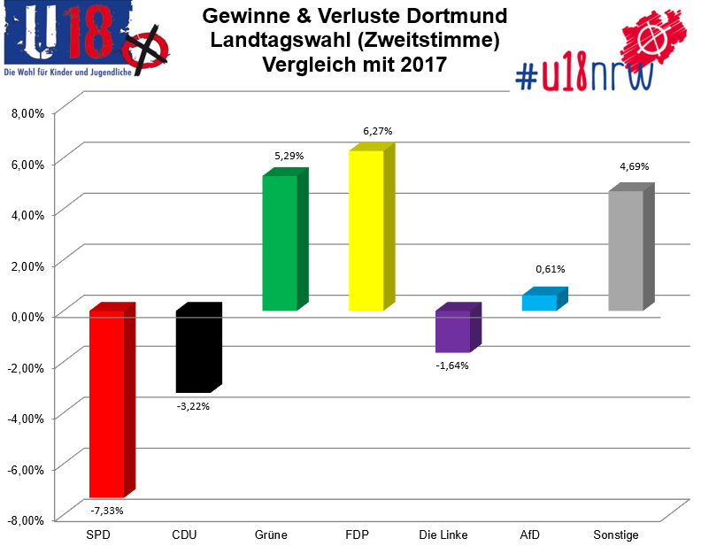 Die Trends ähneln denen der U18-Bundestagswahl in Dortmund im vergangenen Jahr. Nur bei der Linken nicht, da kehrt sich der Trend um. Die Linke verliert einige Stimmen der Jugendlichen.