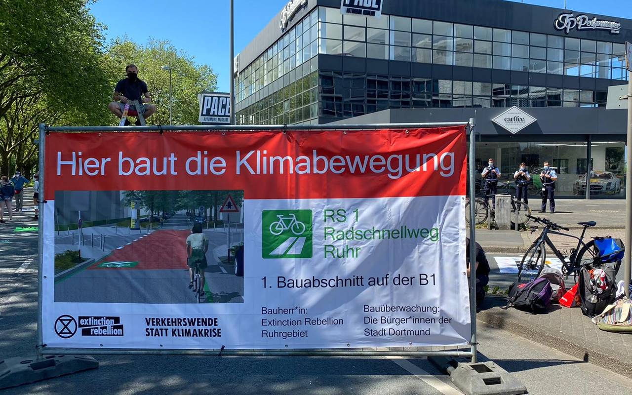 Hintergrund der Aktion: Extinction Rebellion fordert, dass die Stadt die Klimakrise und somit auch die Verkehrswende ernst nimmt – und beim Ausbau des Radschnellweges endlich Gas gibt. Stattdessen hat Dortmund das eigene Ziel jedoch weit zurückgefahren. Statt 2024 soll der RS1 jetzt erst 2030 fertigwerden.