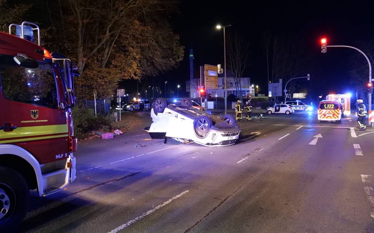 Auto überschlägt sich nach Rotlichtverstoß in Dortmund-Hörde. Wichtige Kreuzung im Berufsverkehr gesperrt. Zwei Autofahrerinnen leicht verletzt.