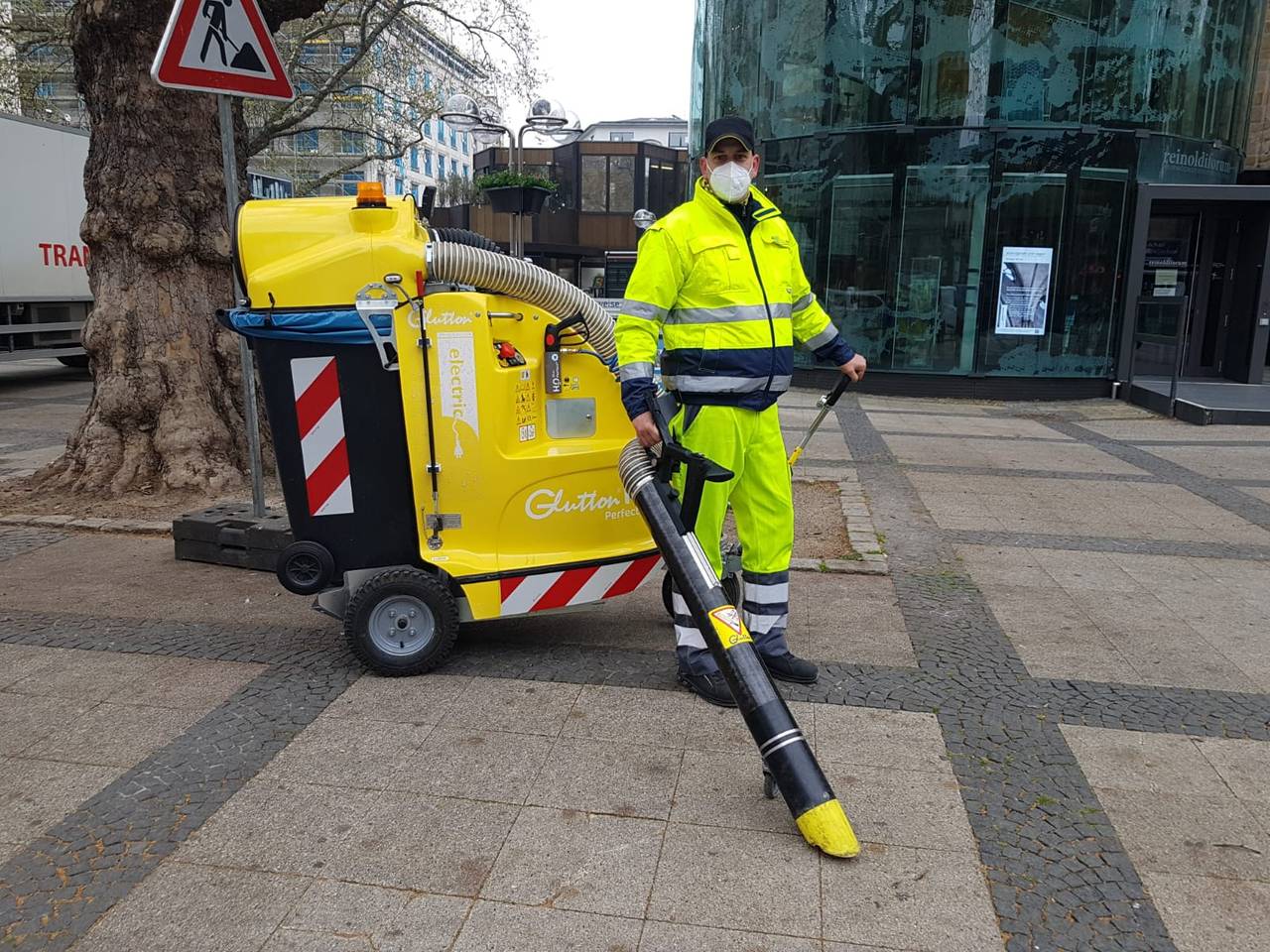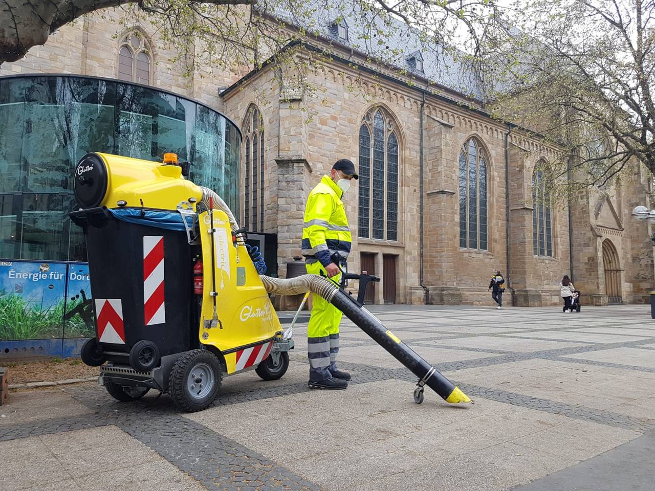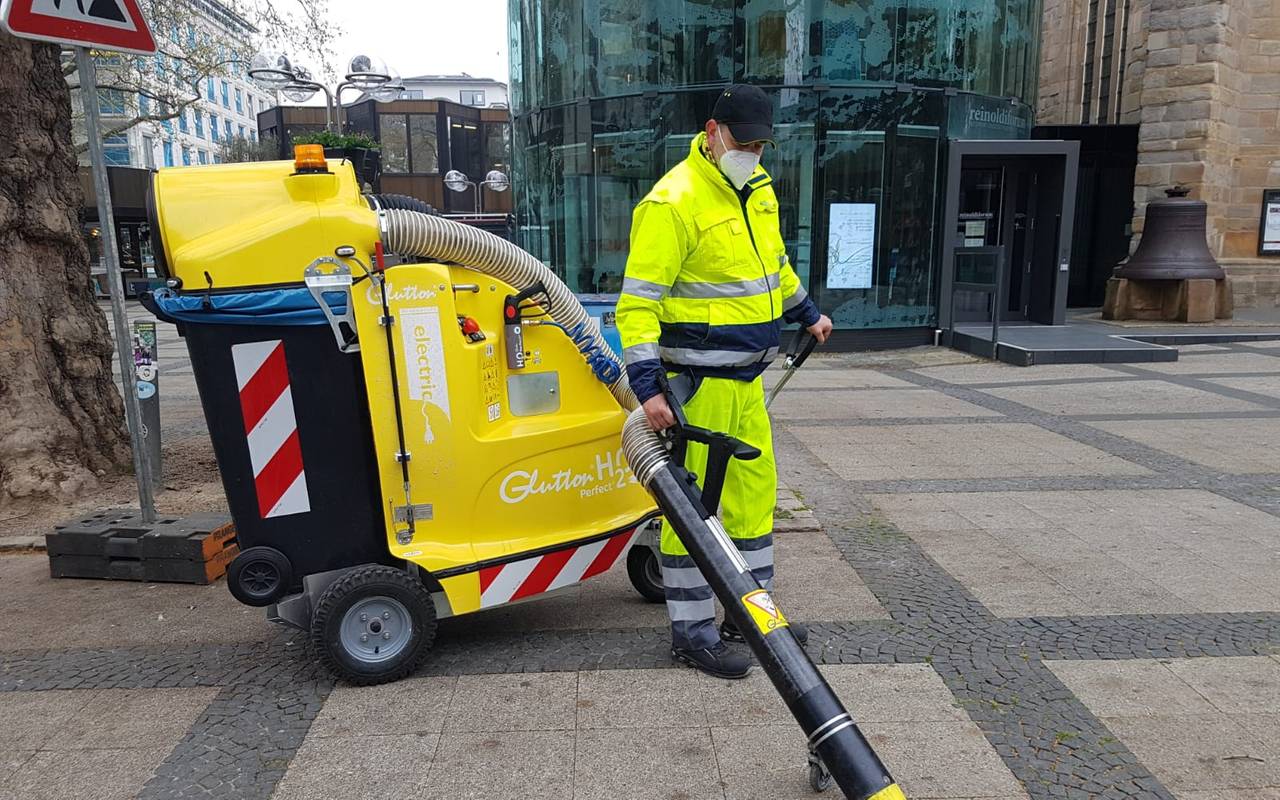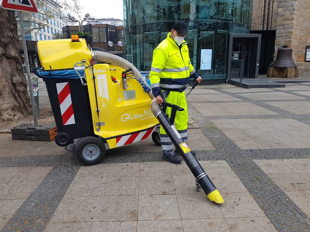Andreas Fritz sieht aus wie ein Ghostbuster, wenn er mit seiner FFP2-Maske und dem langen dicken Saugrüssel seiner elektrobetriebenen Cityputzer-Maschine Schritt für Schritt den Dortmunder Boden reinigt. Dortmund ist sauberer geworden, das bestätigt auch der Profi. Allerdings hat sich auf der Inhalt seiner Mülltonne, die an das Sauggerät angeschlossen ist, geändert.