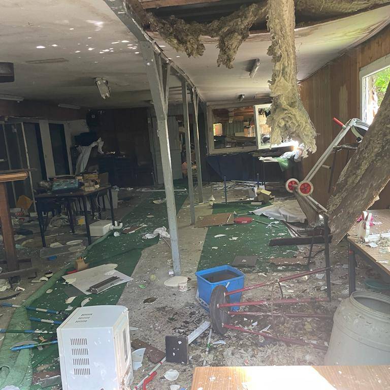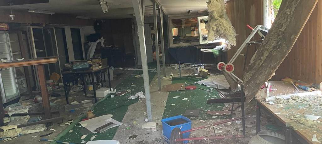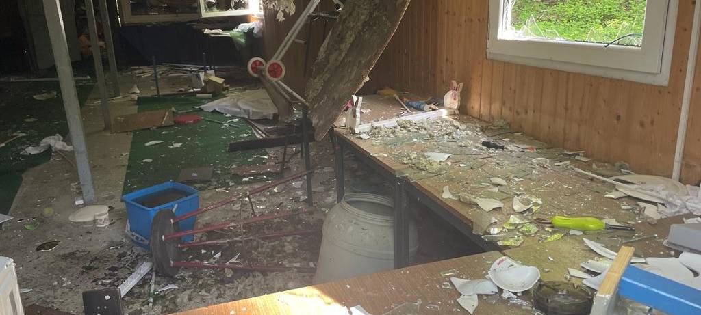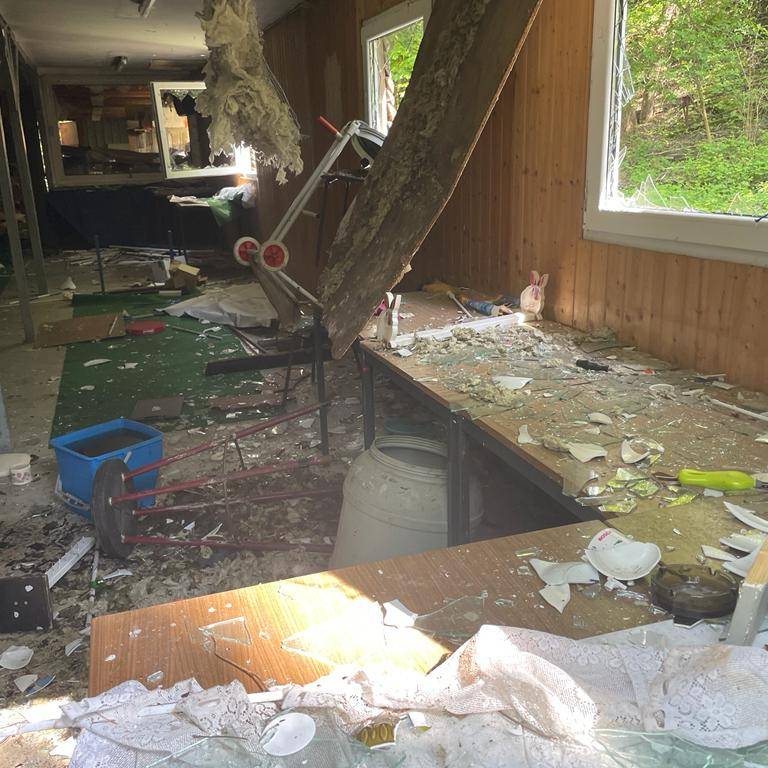 Umgekippte Bäume liegen auf einigen zerstörten Gartenlauben. Randalierer demolierten das Vereinsheim heftig. Bei der Renovierung des Tierschutzgartens benötigt Vivi Hilfe.