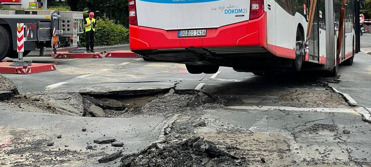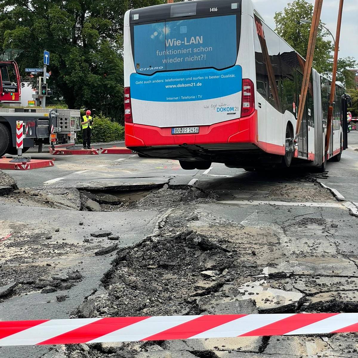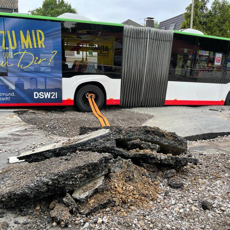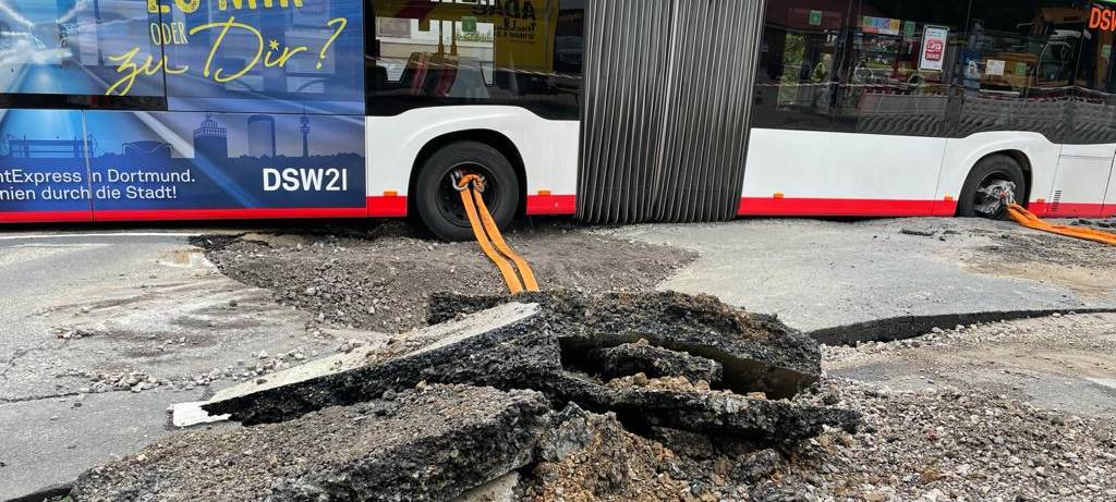 Nach dem Wasserrohrbruch auf der Hagener Straße in Dortmund wurde der Gelenkbus der Dortmunder Stadtwerke geborgen. Am Mittwochmorgen (23.6.) war ein 19 Tonnen schwerer Bus im aufgeplatzten Asphalt der Hagener Straße stecken geblieben. Er musste mit einem Spezialkran geborgen werden.