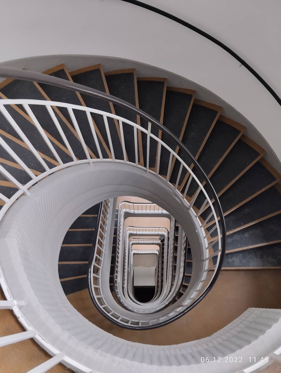 Im siebten Stock befinden sich aber nicht nur die gut gesicherten, fensterlosen Lagerräume des Museums voller historischer und persönlicher Schätze. Ganz versteckt hinter zwei weiteren Türen befindet sich ein Treppenhaus mit kunstvoll geschwungener Treppe, das bisher noch nicht öffentlich zugänglich ist.