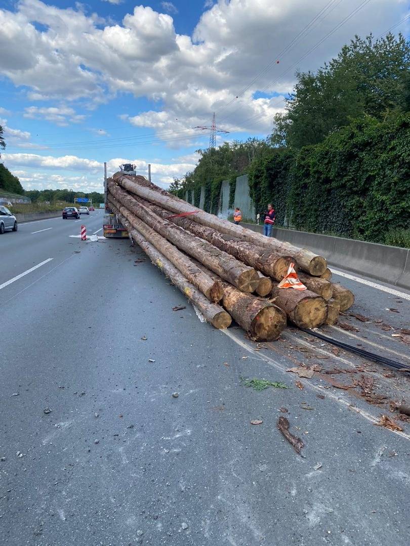 Kaum waren die Aufräumarbeiten beendet, da verunfallte gegen 16:40 Uhr ein Langholztransporter am Westhofener Kreuz in Richtung Bremen. Verkehrsbedingt musste der 33-jährige Fahrer stark abbremsen. Dabei kam der hintere Teil des Aufliegers nach rechts von der Fahrbahn ab und überschlug sich. Ein Teil der Ladung blockierte die rechte Fahrspur und den Abfahrtbereich der A45. Für die Aufräumarbeiten musste die Richtungsfahrbahn Bremen kurzzeitig gesperrt werden.