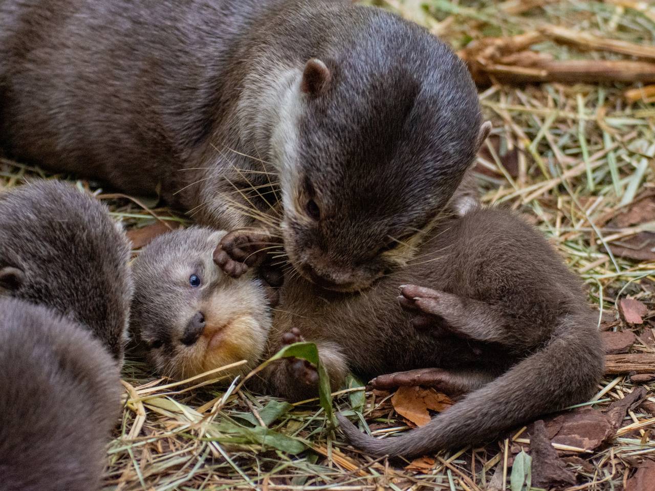 Die jungen Zwergotter entwickeln sich gut. Die beiden Elternteile Malou und Kon beteiligen sich an der Aufzucht ihrer Jungtiere, was nicht immer selbstverständlich bei Zwergottern ist. Es kann auch vorkommen, dass die werdende Mutter den Vater kurz vor der Geburt vertreibt und ihn zunächst nicht zu den Jungtieren lässt.